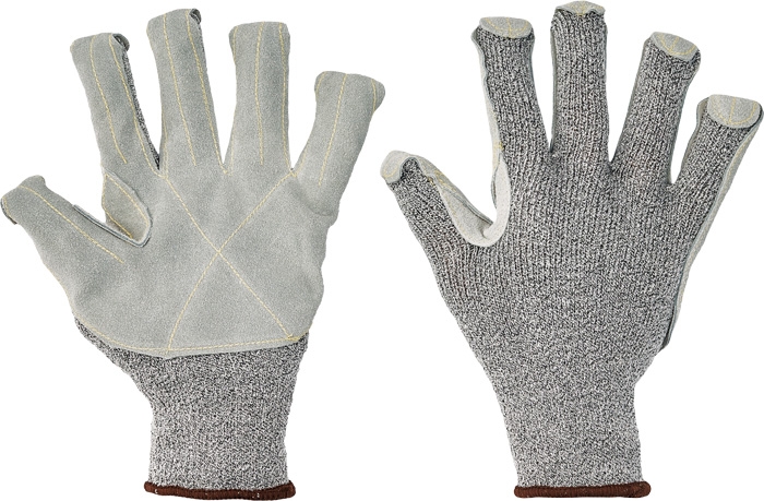 Бесшовные вязаные перчатки из стекловолокна, Spandex и нейлона, рабочая поверхность и кончики пальцев усилены спилковой накладкой, двойной слой спилка между большим и указательным пальцами, устойчивость к порезам кл. 5.