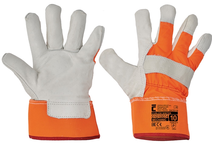 Утепленные комбинированные перчатки с подкладкой. Область ладони выполнена из лицевой кожи, тыльная сторона - полиэстеровый трикотаж в сигнальных цветах.
