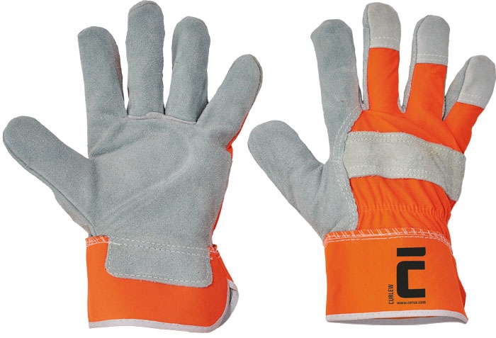 Комбинированные перчатки с подкладкой. Область ладони выполнена з одноцветного спилка, тыльная сторона - полиэстеровый трикотаж в сигнальных цветах.