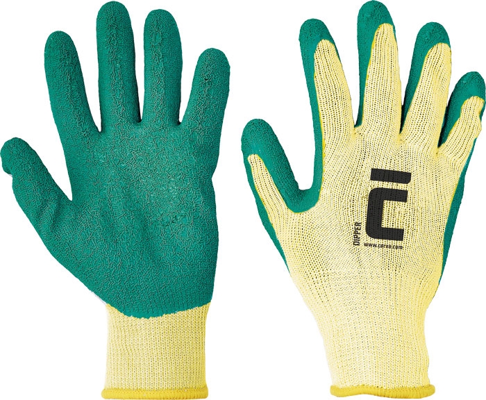 Бесшовные вязаные перчатки из смеси хлопок/полиэстер, частичное покрытие из натурального латекса, противоскользящая поверхность в области ладони и пальцев, эластичная манжета. Размеры: женский 7, 8 (зеленый), мужской 9, 10, 11 (серый)